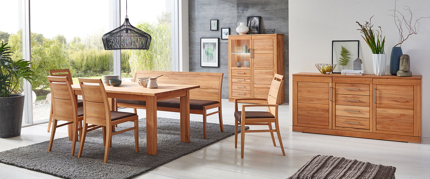 Mit CASERA gestalten Sie Ihr Esszimmer natürlich - und einzigartig. Charakteristische Färbungen, lebendige Maserungen und natürliche Asteinschlüsse machen Ihr Möbelstück zu etwas ganz Besonderem.