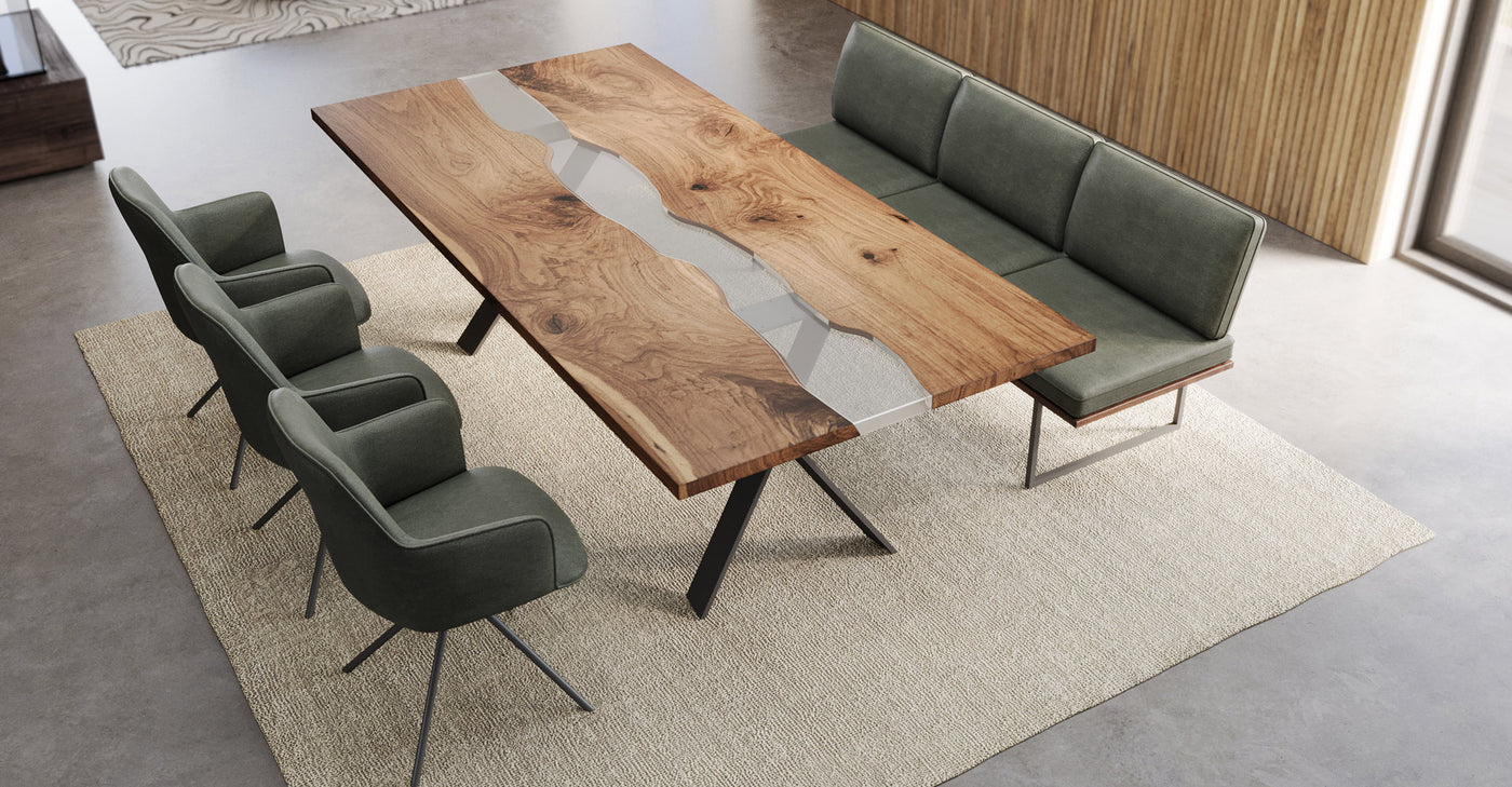 Jeder Tisch ist ein handgefertigtes Unikat, das Kunst und Natur verbindet – ein funktionales Möbelstück und Kunstwerk zugleich. Rivercraft zeigt, wie edel Individualität aussehen kann. Wählen Sie Ihre persönliche Harzfarbe, den Kantentyp und Ihr Wunsch-Untergestell.