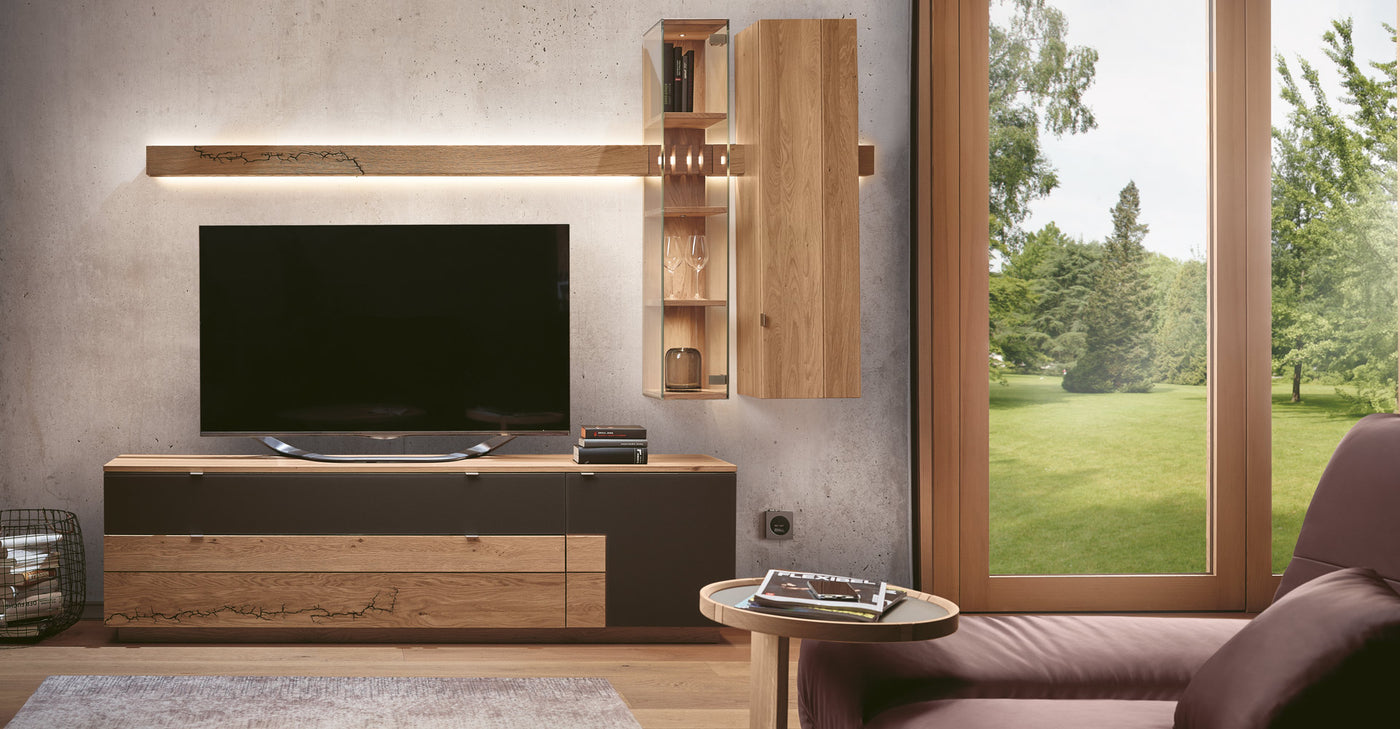 Der Trend geht zu offenen Wohnkonzepten mit natürlichen Materialien und viel Helligkeit. Auch die SIGNATURA‐Wohnwand überzeugt mit integrierten Lichtquellen, Fronten aus Farbglas und hochwertigem Massivholz.
